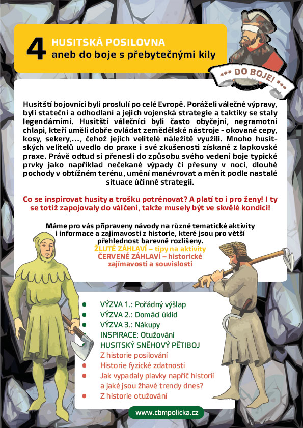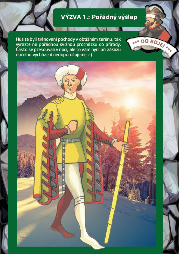 Husité byli trénovaní pochody v obtížném terénu, tak vyrazte na pořádnou svižnou procházku do přírody. Často se přesouvali v noci, ale to vám nyní při zákazu nočního vycházení nedoporučujeme :-)